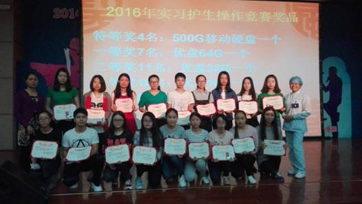 护生共有12人次获奖,其中刘婉薇和梁志欣分别获得静脉输液组和青霉素皮试组特等奖;李雪莹和严海艺分别获得青霉素皮试组一等奖和三等奖;钟钰瑜获得无菌技术组组一等奖,邓美玲和庄静仪获得该组二等奖,蒋欣君和张尧获得该组三等奖;张玉莹获得穿脱隔离衣组二等奖,曾婷和吴敏华获得该组三等奖。在颁奖仪式上,叶桂连老师和李汝群护长为获奖选手颁发证书和奖品。