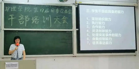 首先,欧丽娅主任进行关于“敢于挑战,勇于担当,努力成为优秀学生干部”的主题演讲,获得了全场热烈的掌声,同学们收获良多。