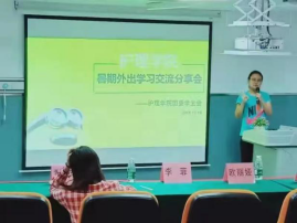 许日娣师姐分享交流学习时拍的照片,讲述创新的要素、特点和性质。许日娣师姐通过介绍她参加交流学习时老师的话语,引出护理行业创新的三要素分别是创新思维、医护合一的思想和多学科交叉;创新的六个特点是:普遍性、承担性、超前性、艰苦性、社会性和无止境性。她认为只要有人类,就一定有创新,一切领域都存在创新,原创和首创尤为重要。
