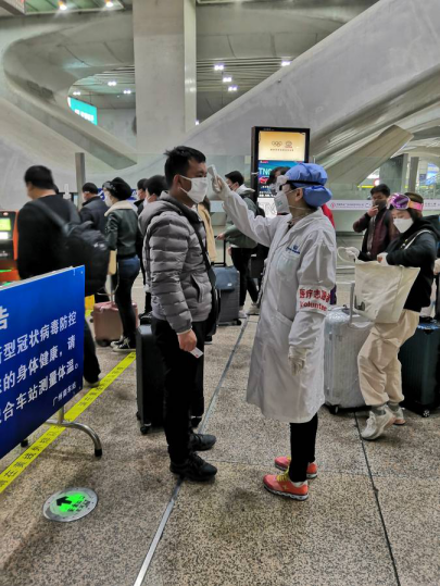 2016级护理学专业李慧景同学在广州南站给乘客测量体温