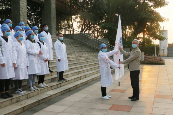 学生踊跃响应报名,共有8名护理学专业的学生加入首批志愿队伍,他们在指导老师和辅导员的带领下,分班次前往广州南站等广州主要交通站点开展测量体温等志愿服务。2月1日志愿者出征仪式上,学校党委书记冉丕鑫为队伍授旗,王新华校长等学校领导为队伍助威壮行。