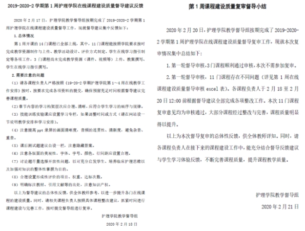 新冠肺炎防控期间在线教学督导工作方案(试行)》。通过在线课程建设质量的督导初审、课程整改、督导复审,确保每门在线课程的建设质量符合标准。通过专家交叉督导、课程教学质量持续改进、主管院领导抽查的闭环式督导工作,确保每门在线课程的教学质量符合要求。
