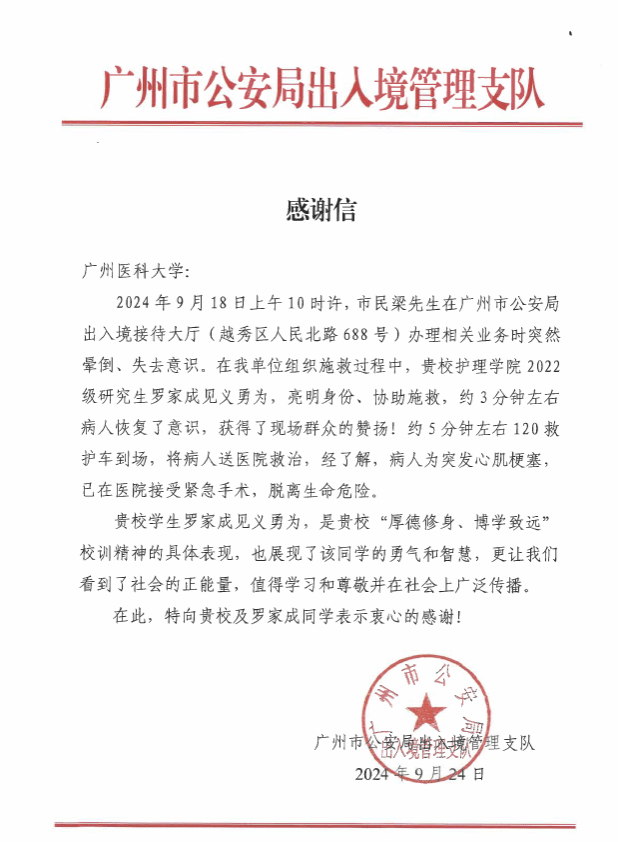 2024年9月18日上午10时许,市民梁先生在市公安局出入境接待大厅办理相关业务时突然昏倒、失去意识。在现场组织施救的过程中,我校2022级护理学专业硕士研究生罗家成同学挺身而出,亮明身份,协助施救,约3分钟左右梁先生恢复意识。罗家成同学以扎实的专业能力,对病情进行了准确判断,沉着冷静地实施了专业急救,为患者争取了宝贵的院前时间,并安抚住了紧张不安的家属。罗家成同学的义举,得到了在场群众和民警的一致赞扬,称赞他不仅专业素养过硬,而且心地善良、有责任感。