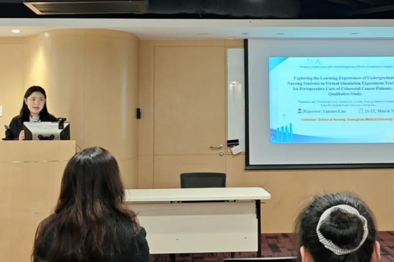2022级的罗燕梅同学作为团队代表发言,以《本科护生对结肠癌患者围手术期护理虚拟仿真实验教学的学习体验:一项质性研究》为题进行英文口头汇报。她结合自身学习经历,分享了在我校护理教育中,通过虚拟仿真实验进行结肠癌患者围手术期护理的学习体会,展示了我校在实践教学创新方面所做的探索与努力。此外,同学们也认真聆听其他讲者的研究报告,学术交流火花四溅,氛围热烈。这次参会经历不仅展现了我校护理学子的专业素养,更体现了学院"以学生发展为中心"的培养理念——既重视虚心学习,也鼓励大胆展示。从听众到讲者,每一个角色都是成长的阶梯!