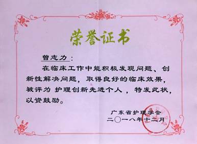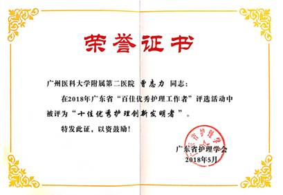 摹然间回首,吾已在血透护理的路上坚行十载。十年间,获得省、市级创新类奖项21项,先后被评为广州市优秀护士、广州市青年岗位能手、护理创新发明者”、广东省护理学会“优秀创新先进个人”、广东省“十佳护理创新发明者”等称号。