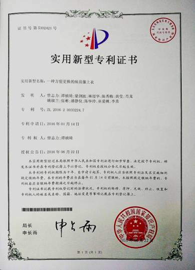 2014年,切缝是他进入职业生涯在规范化培训轮科学习关键时期。那一年,在中心ICU一区轮科期间,每天上班都要给卧床患者进行床上浴与更衣操作,这种平常而又不普通的卧床病人沐浴与更衣操作使他有很深的感触,同时也总结了其他同事对这种工作中不愉快的感受,作为创新改正的突破口,面对现有普通病员服上衣一般为胸前正中处开襟结构(见图7),类似纽扣或系带的连接件设置在对开襟上,使用此类病员服上衣为卧床病人更衣时,需完成至少三步操作:①将病人推向左/右侧翻身,穿以上一侧肢体衣服;②再将病人放置平躺卧位,进行转身过渡;③再将病人推向对侧翻身,完成另一侧肢体穿以上衣服;④再将病人放置平躺卧位。执行操作过程中,较消耗体力,且对于重症病人有比较多的各种管道,短时间内反复翻身给患者带来较多痛苦,使用存在了一定的局限性。针对这个一直困扰工作的问题,他另辟蹊径,提出的采用侧开襟设计的病号服(见图8),其称《一种方便卧床病人更换的病员服上衣》(见图9),此衣服的设计,为病人更换上衣时,只需执行二部操作:①将病人推向左/右侧翻身,套上衣服;②再将病人放置平躺卧位,将另一肢体衣服穿上(见图10)。其更换衣服操作过程中,只需对病人翻转一次,有以下优点:①避免短时间内对病人的频繁翻动身体而产生的痛苦;②减少了病人的换衣时间,大大提升了工作效率;也可以减少患者的翻动次数,降低了护士更衣时的劳动强度,节省了体力,对长期从事这一操作的护士职业安全有保障。