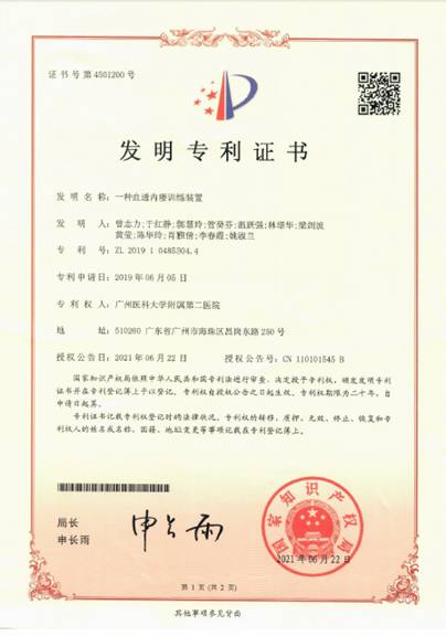 截止2021年7月7《一种血透内瘘训练装置》获得了国家专利局发明专利授权(见图17-18),此装置可以有效解决动静脉内瘘手术者因缺乏专业的功能锻炼专门器械,自身的内瘘功能锻炼使得恢复周期长,发生并发症的等问题。实现了规范量化、机械的辅助内瘘功能训练,提高了动静脉内瘘术后患者功能锻炼的积极性,有量化指标考评的功能训练器械有利于患者进行规范化功能锻炼训练,大大提升康复效果,具有一个里程碑的意义。