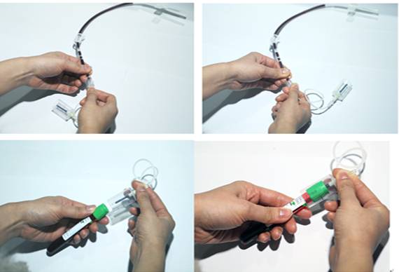 改良后的采血方法:①动静脉内瘘穿刺;②将TTAN的螺旋卡口转换接头与内瘘穿针连接;③依次将采血试管插入防针刺护套内,完成血标本的密闭式采集。(见图5)